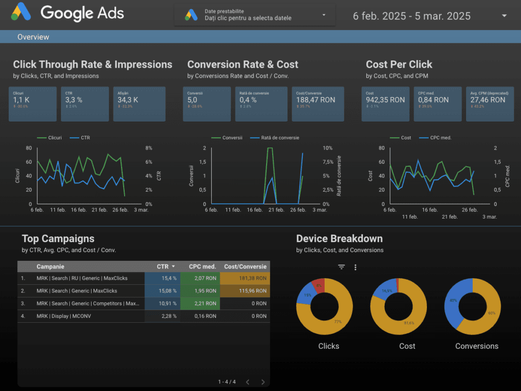 Urmărim valorile cheie—ROI, ROAS, CTR, CPC, CPA-analiza comportamentului utilizatorului și ajustări reclame publicitare, oferte și strategii de licitare spre mai bine cost pe plumb.